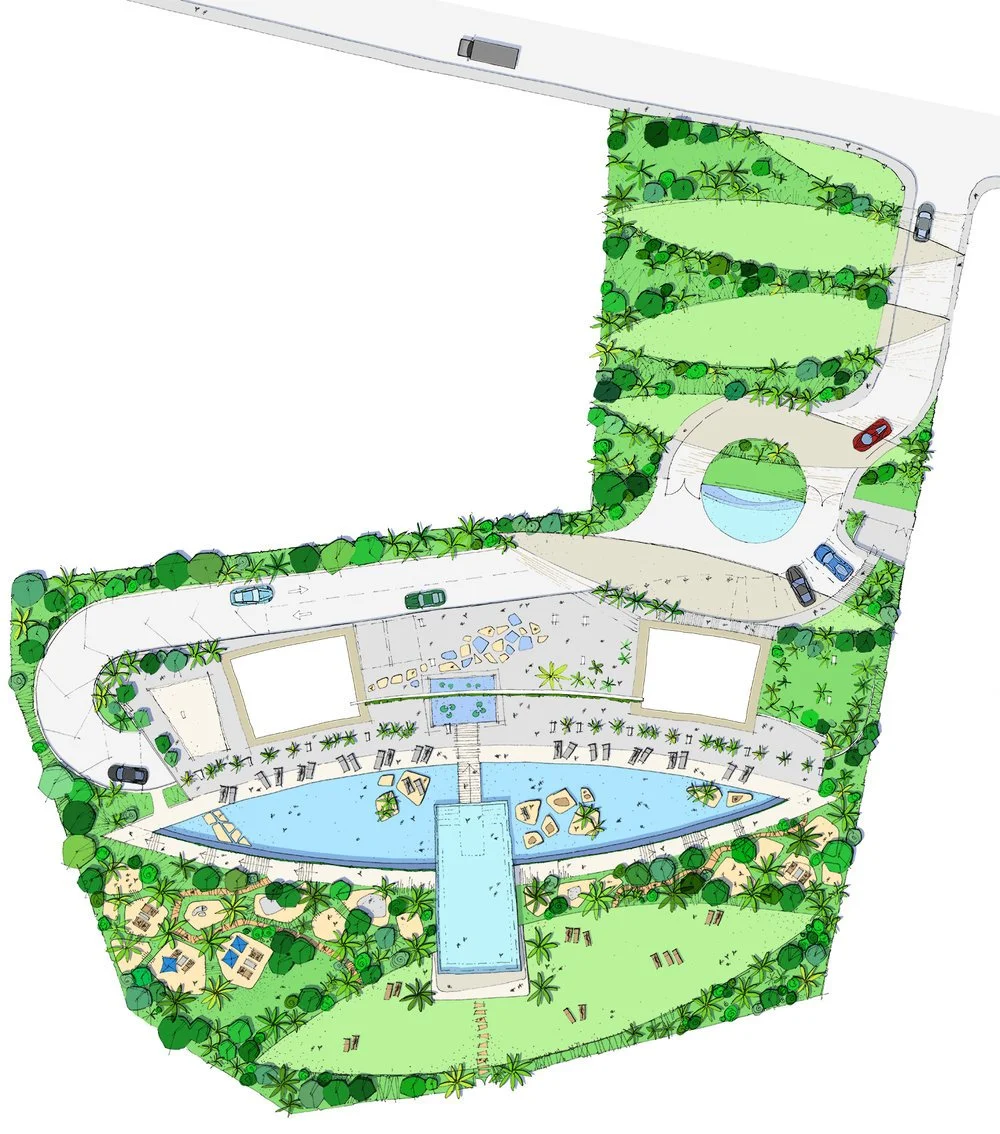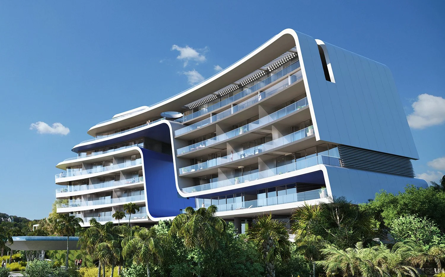 The Amanera Residences is a luxury residential project designed to embody the Mediterranean lifestyle through a seamless connection to nature and to engage all five senses. Located steps from the beach, the development comprises two distinct, gently curved seven storey buildings linked at the ground and rooftop levels. Each building features independent access and reception areas, ensuring privacy, while a common underground parking facility provides direct access to all floors.
