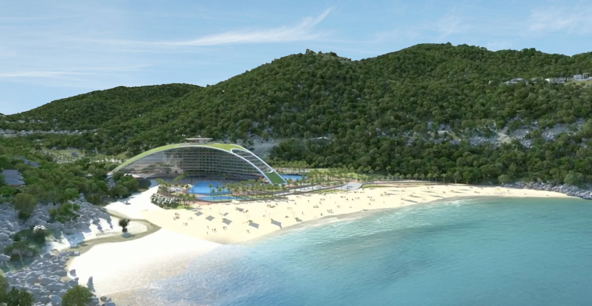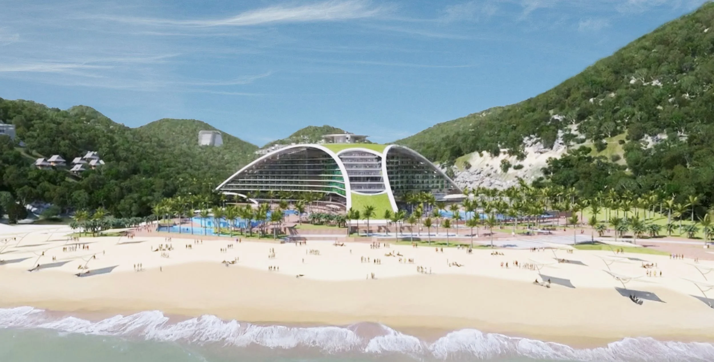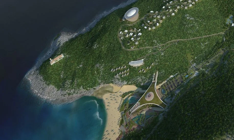 Bay Mon Hotel is a 250 key luxury beach resort located in the picturesque Vung Ro Bay area of Phu Yen province, at Vietnam’s most eastern point. The 10 storey hotel is designed in a distinctive Y shape, with three curving wings that sweep down from the rooftop to the ground level, seamlessly blending into the lush natural landscape. The green, landscaped roof functions as a striking fifth facade, offering a unique visual experience from the surrounding hills.