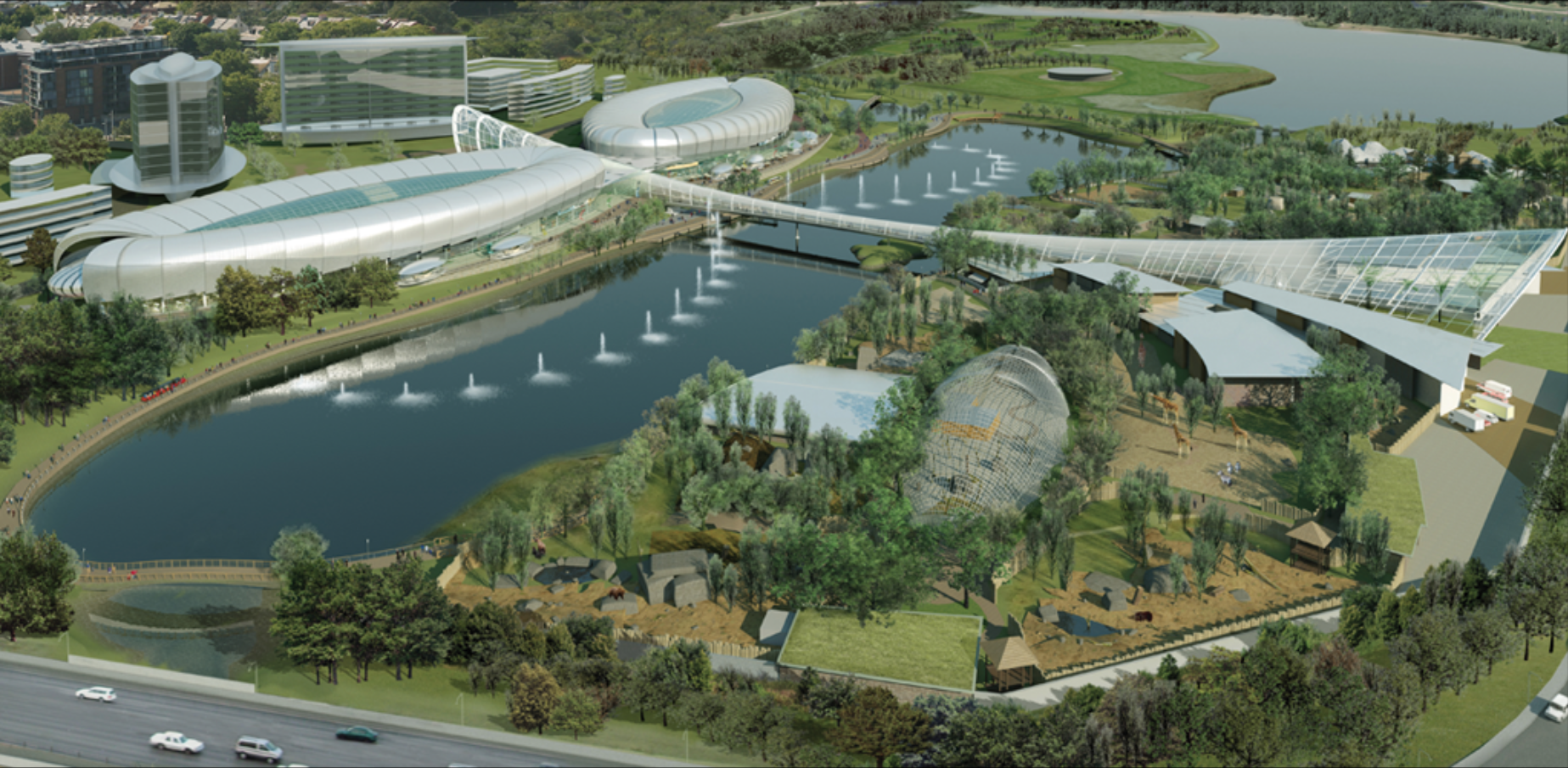The current zoo will be relocated to a greenfield site across a lake, setting a serene, natural habitat away from the city’s core. A signature bridge, inspired by the form of the “strikaza” (dragonfly), will serve as both a symbolic and functional link between the zoo and the city. This tubular structure not only acts as a connection but also features a winter garden on the retail side, showcasing a historically significant collection of subtropical plants and culminating in an impressive tropical house at the zoo’s entrance.