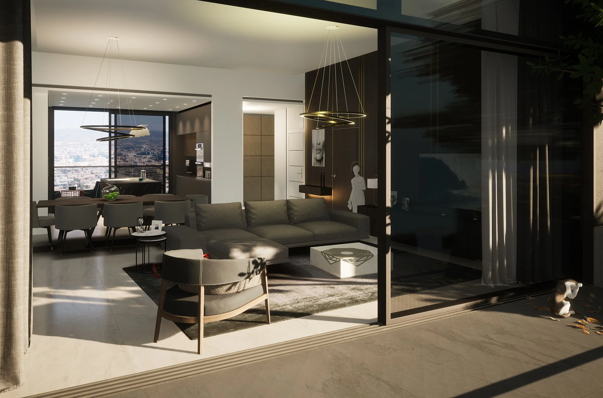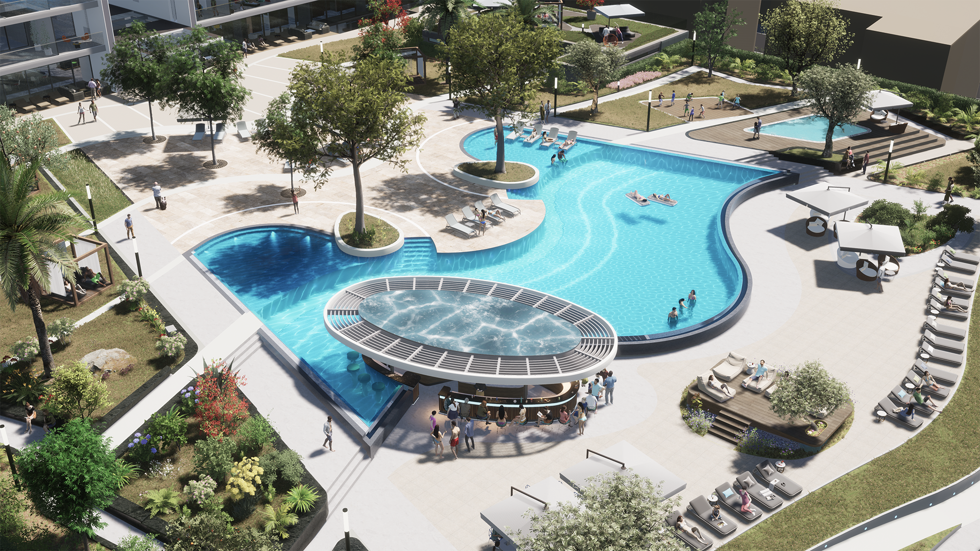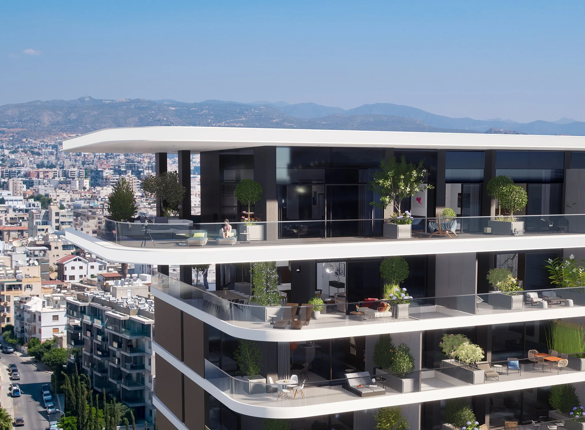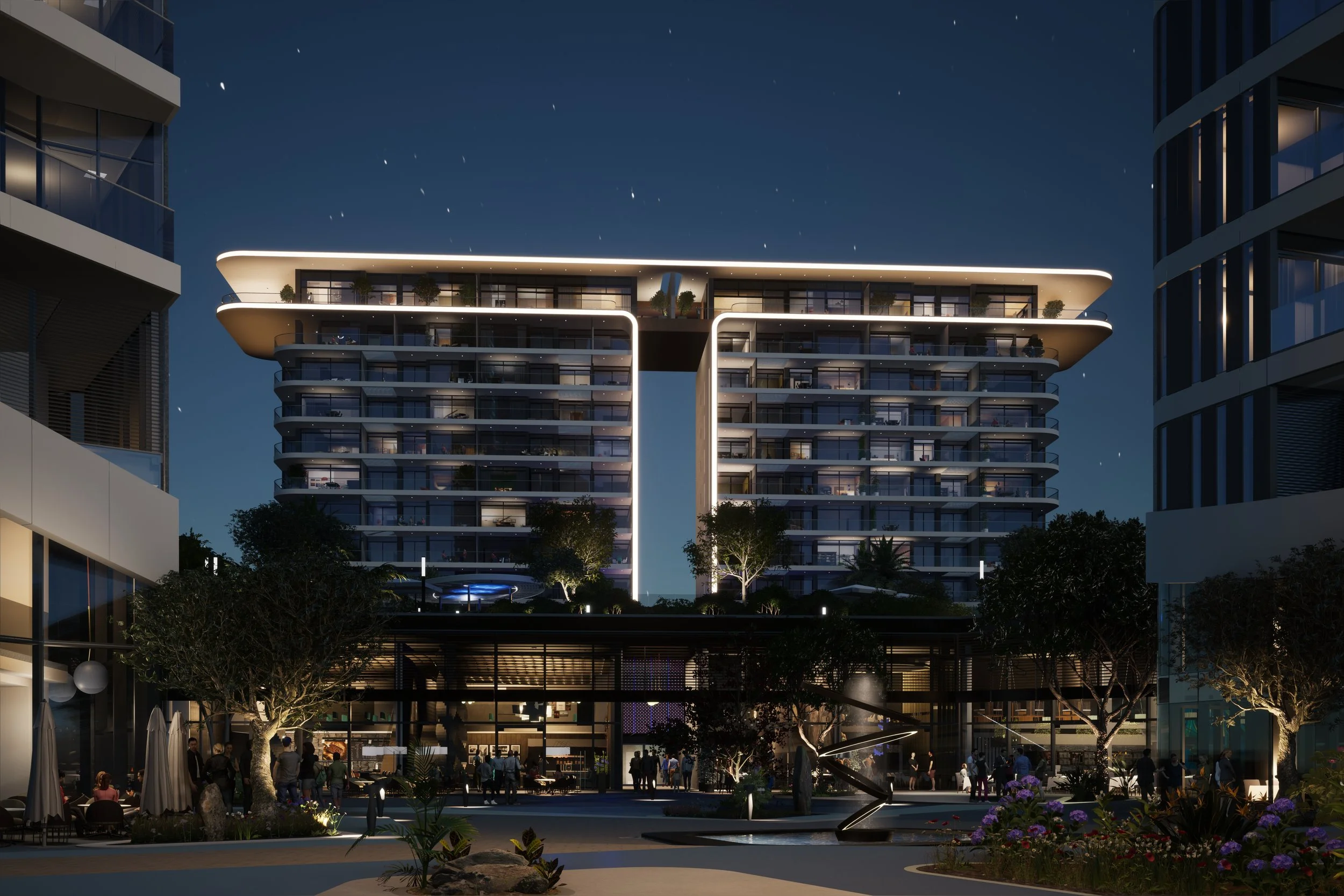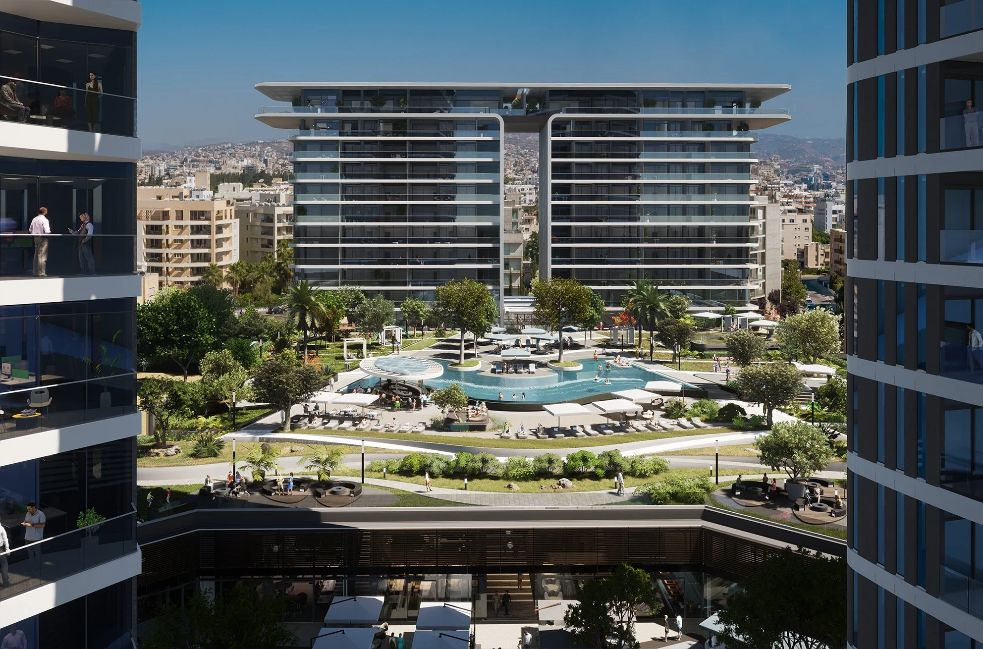 Trilogy North Residences emerges gracefully above a private oasis, serving as a refined and understated complement to the commanding East and West towers. It complements them, enhancing the overall balance of the Trilogy complex. Nestled behind the oasis, the North Residences offer sweeping views of the Mediterranean, the city and the vibrant plaza below, creating a sense of connection between nature and urban life.