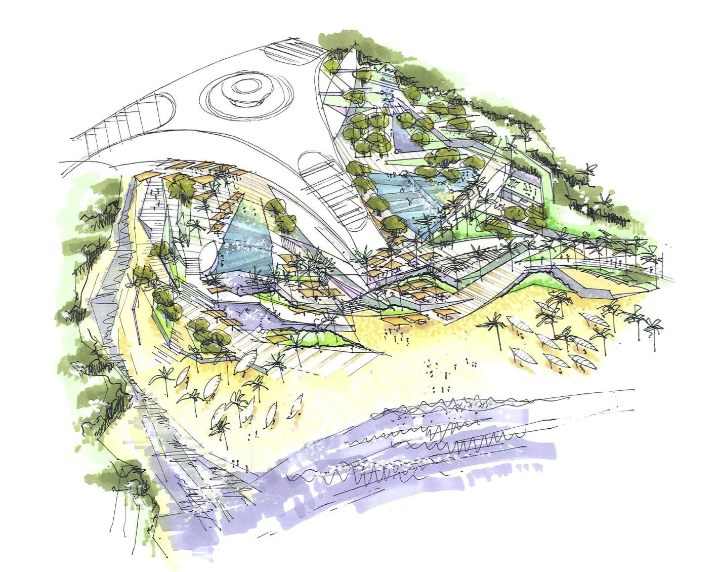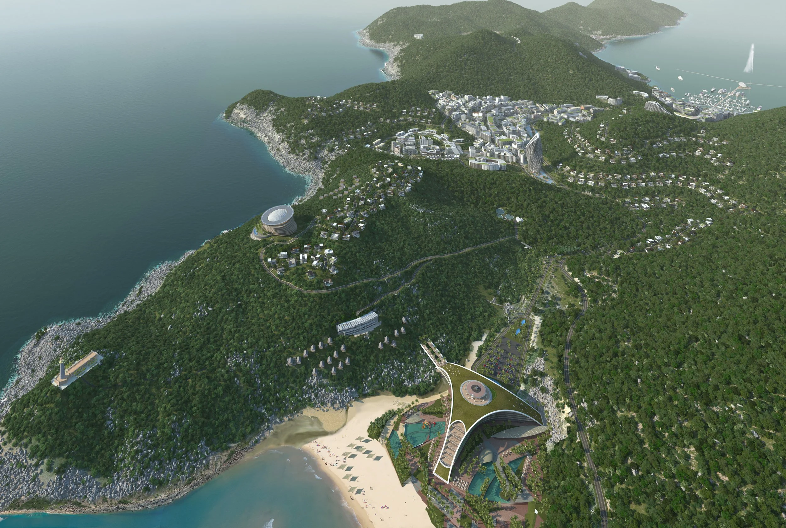 The Vung Ro Bay design principles embedded in the masterplan emphasise sustainability, adaptability, diversity, public realm optimisation and accessibility. Three distinct zones shape the overall vision: the cascading marina development, offering panoramic sea views; a small town nestled in the valley; and Bay Mon, home to a stunning beach resort and the historic 1890s lighthouse which represents the most eastern point in Vietnam. A continuous thread of green landscape links these areas, forming a cohesive, walkable environment that blurs the line between nature and architecture.